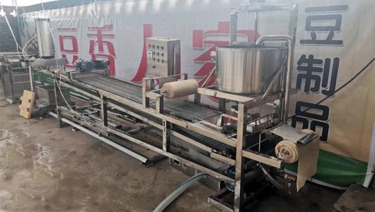 据此, 商丘市乐豆机械设备有限公司新研制而成的全自动豆腐皮生产线, 只需1-2 人即可生产豆腐皮,所生产的豆腐皮成本低产量高,宽窄厚薄均可调整、产品色泽一致, 筋度好吃,口感良好, 开创了豆腐皮生产方面一次新的改革,是目前生产豆腐皮机械的新型改良机械。